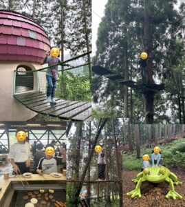 木で作られた大きな遊具や吊り橋などのアスレチックがあり