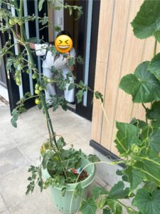 きゅうり、ミニトマトの苗を植え、支柱立てを行い…