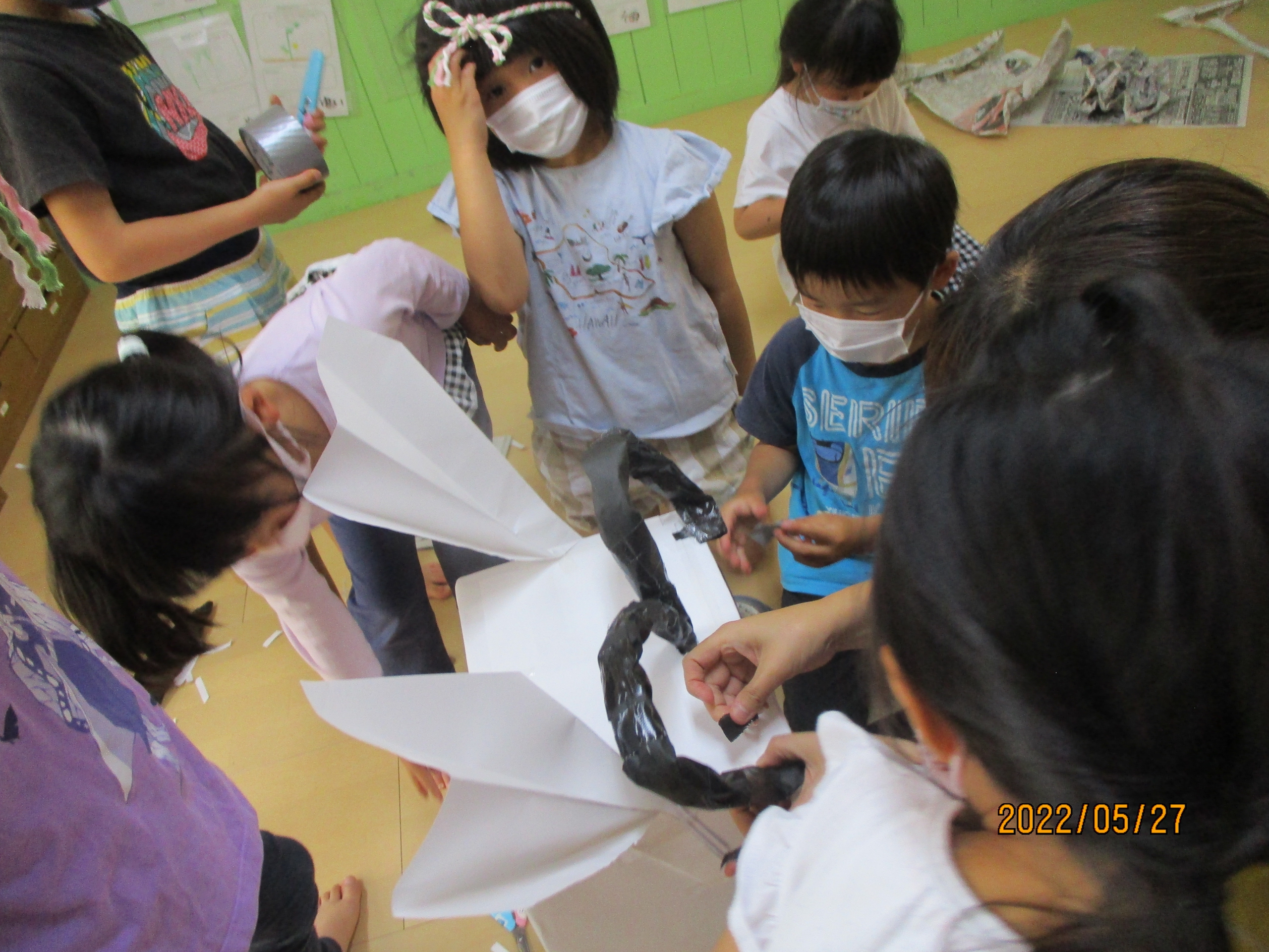 祭を見に行った次の日から、「ぼくたちもつくりたーい!」「太鼓や笛吹いてる人もいたよ!」と山車に興味を持ち始めたくまぐみの子どもたち。友だちと協力しながら作っていました。