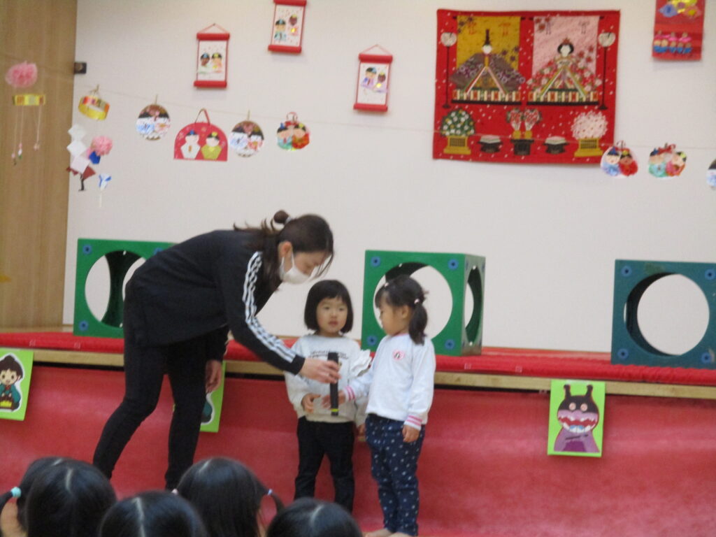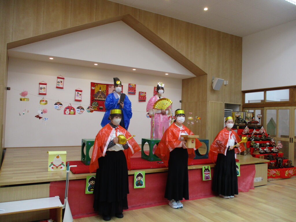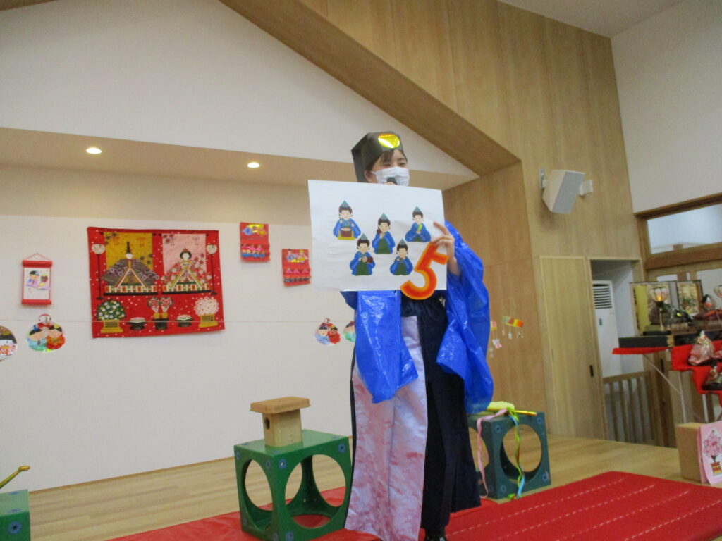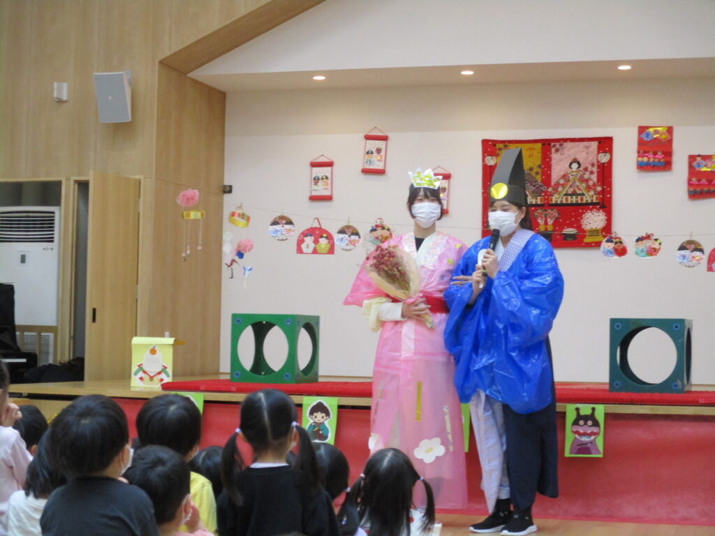 最後に保育士が「お雛様」「お内裏様」「三人官女」に扮して登場!子どもたちは歓声を上げて大喜び!