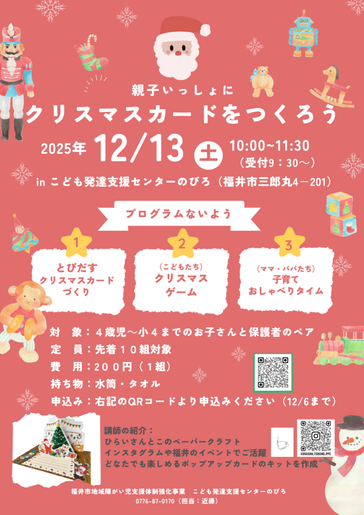 12/13開催 親子いっしょにクリスマスカードをつくろう 2025 11/06 お知らせ 2025年11月6日 今年最後の保護者サロンになります。1年を振り返ったり、来年に向けて話したいこと・聞きたいことをみなさんでおしゃべりしましょう!ぜひ、ご参加ください。 お知らせ URLをコピーしました! たくさんの絵本いただきました! 関連記事 Echo Roomの体験イベントを開催します(9/13) 2025年8月21日 小学校高学年~中学生対象の放デイグループを開催します 2025年8月21日 親子ふれあい遊び教室を開催します(9/6) 2025年8月15日 パパサロンを開催します。(8/2) 2025年7月17日 保護者勉強会を開催します。(7/19) 2025年7月9日 のびろの【保育所等訪問事業】に関する評価結果を公表します 2025年3月21日 のびろの事業所評価結果を公表します 2025年3月1日 「のびろ」の支援プログラムを公開いたしました。 2025年2月6日